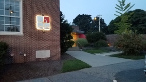 Since posting pictures of Bryley’s roofing-project crane, I thought these nighttime pictures of our historic building might be of interest. It was built in 1937, but has been completely renovated.